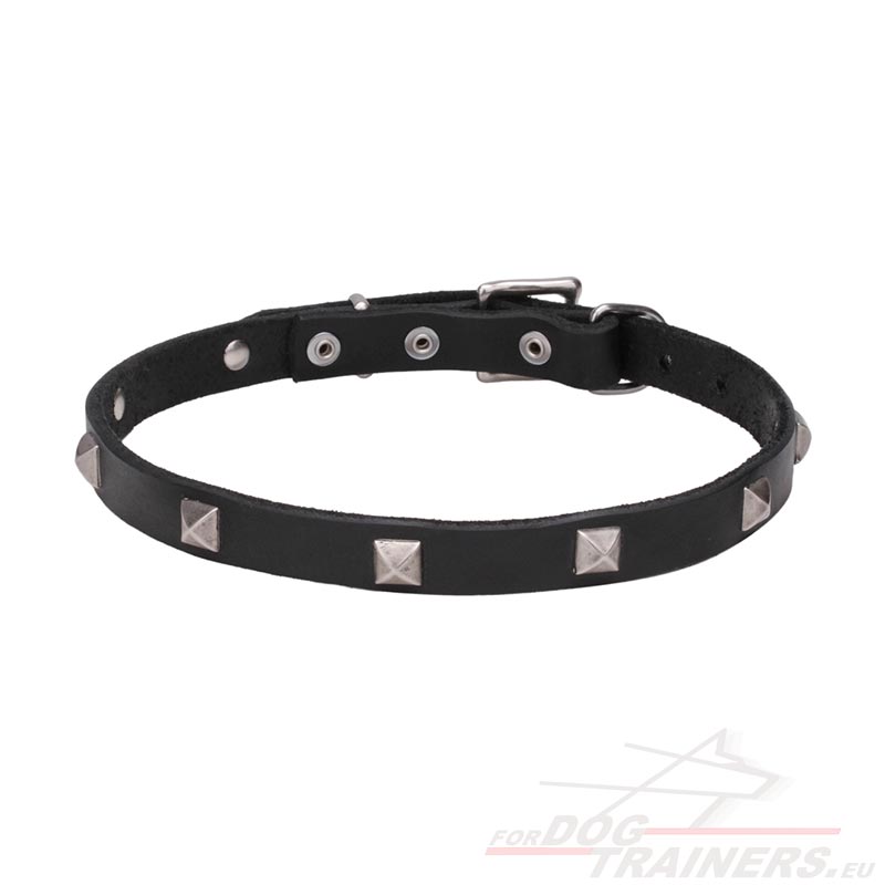 Il collare stretto di 2 cm di larghezza è adatto a tutte le razze canine. Il modello è realizzato in pelle naturale di alta qualità ed ha le borchie cromate quadrate. Le borchie sono fissate solidamente, resistono all'umidità e